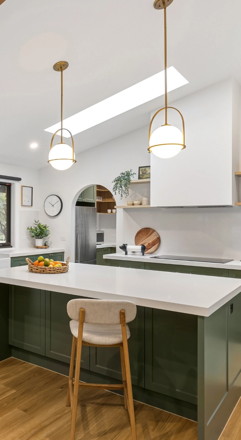 A ilha aumenta a funcionalidade da cozinha, oferecendo mais bancada, arrumação e possibilidade de integrar eletrodomésticos, além de criar um ponto central de convívio.