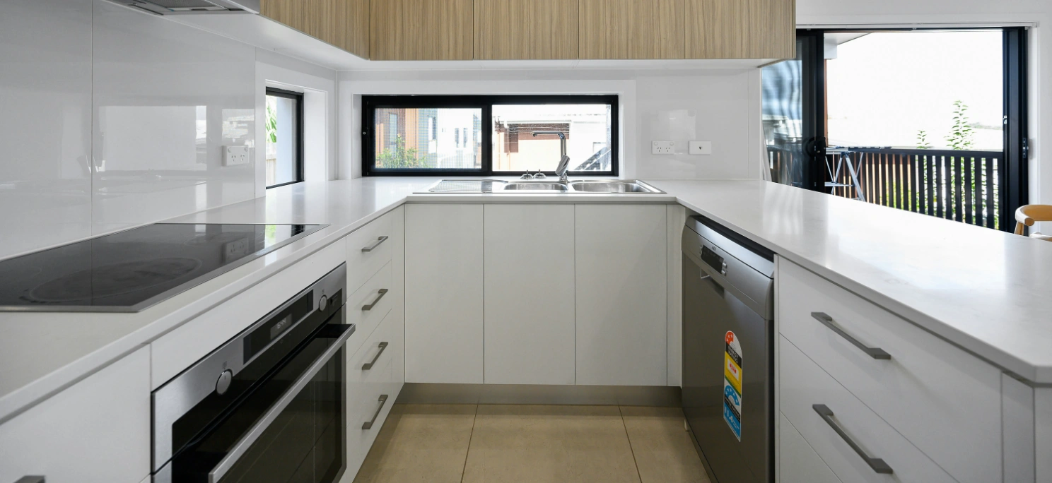 O formato em U maximiza a arrumação e proporciona bancadas amplas, permitindo distribuir eletrodomésticos e zonas de uso de forma funcional, uma vantagem essencial para famílias que necessitam de organização diária.